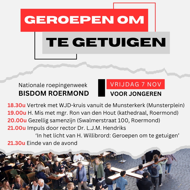 Op vrijdag 7 november komt het WJD-kruis naar Limburg. Dit is onderdeel van een estafette langs alle Nederlandse bisdommen in het kader van een landelijke roepingenweek. De estafette eindigt een dag later tijdens de landelijke Katholieke Jongerendag.